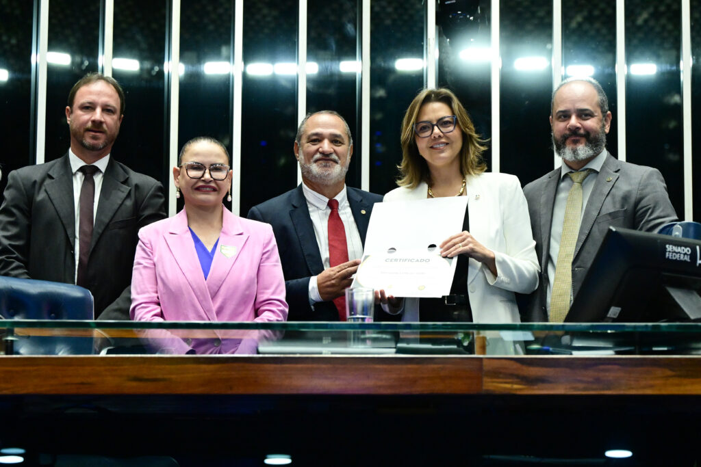 Plenário do Senado Federal durante sessão especial destinada a celebrar o Dia do Policial Civil. Entrega de homenagem à senadora Leila Barros (PDT-DF) pelo Sindicato dos Delegados de Polícia Civil do Distrito Federal (Sindepol). Mesa: delegado-geral adjunto da Polícia Civil do Distrito Federal (PCDF), Saulo Ribeiro Lopes; presidente do Sindicato dos Delegados de Polícia Civil do Distrito Federal (Sindepo) Cláudia Alcântara; presidente do Sindicato dos Policiais Civis do Distrito Federal (Sinpol-DF), Enoque Venâncio de Freitas; presidente e requerente desta sessão, senadora Leila Barros (PDT-DF); diretor de Assuntos Parlamentares da Confederação Brasileira de Trabalhadores Policiais Civis (Cobrapol), Alex Galvão. Foto: Geraldo Magela/Agência Senado